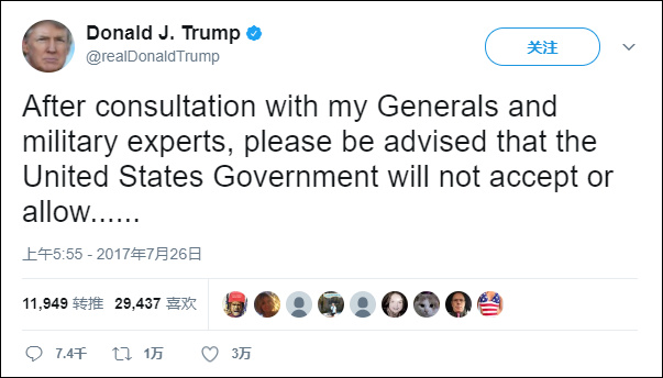 7月26日,特朗普連發三條推特,表示將禁止跨性別士兵服役