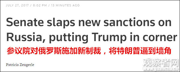 特朗普現在被逼到了牆角,路透社這樣説。迫於國會壓力批准法案非特朗普所願,而否決法案又將得罪他所在的共和黨同僚。況且,特朗普政府如今深陷“通俄門”泥淖中難以自拔,否決這項法案可能將面臨重大反彈。
