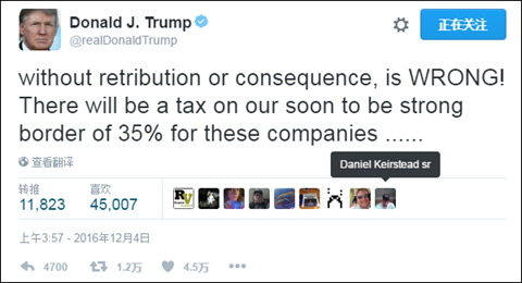 特朗普威脅那些試圖離開美國的大公司,小心邊境税(圖:推特)