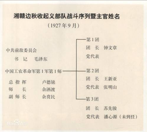 1個月後參加秋收起義的部隊由原武昌國民政府警衞團、安源工人武裝和平江、瀏陽的農民軍組成,共約5000人,被合編為工農革命軍第一軍第一師。
