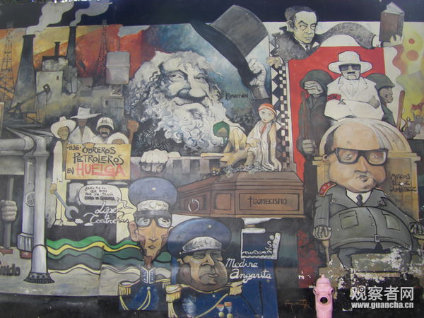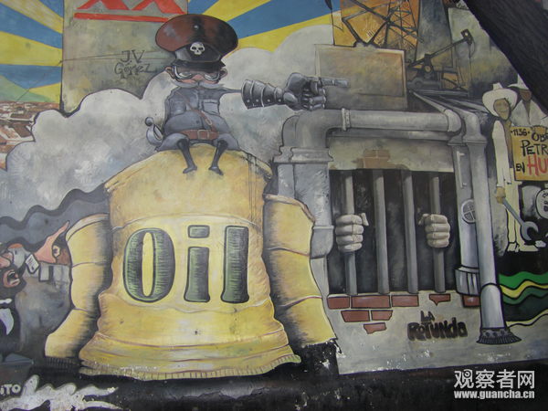 委內瑞拉最初發現石油的時候是在軍人獨裁時代,漫畫中的這位軍人是戈麥斯(Juan Vicente Gomez,1857-1935),他統治了委內瑞拉30年左右,在他任內開發了第一口油井。委內瑞拉的街頭有大量政治漫畫,很多水平相當高,這就是其中的一幅。