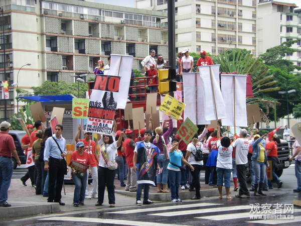 這是在2009年關於取消總統任期限制的公投之前,查韋斯的反對派和支持派在街上拉票,反對派舉着“不”(no)的牌子,支持派舉着“是”(si)的牌子,後面還有一輛支持派的宣傳大巴。公投、拉票、遊行……這類活動在委內瑞拉多如牛毛。