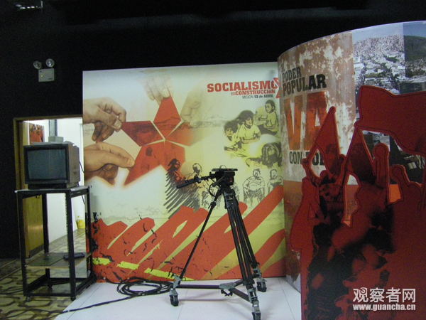 查韋斯的玻利瓦爾革命鼓勵草根社區建立自己的新聞機構,這是加拉加斯貧民窟自辦的電視台,剛剛製作了一部政治討論節目,背景畫中有貧民窟(右上角),有揮舞旗幟的示威活動(右下角),還有社會主義的標語(正面)。