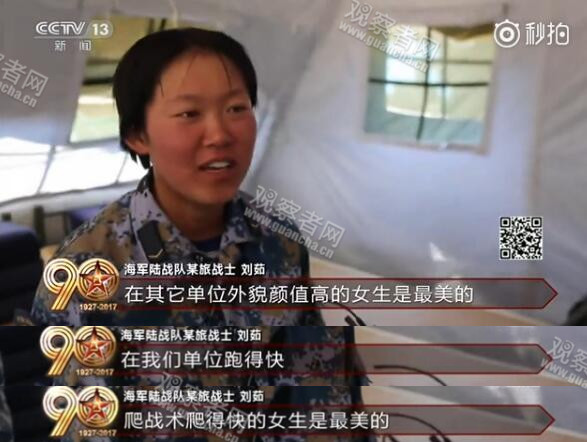 另一位海軍陸戰隊戰士表示,在其他單位外貌顏值高的女生是最美的,在這裏,跑得快,爬戰術爬得快的女生是最美的。