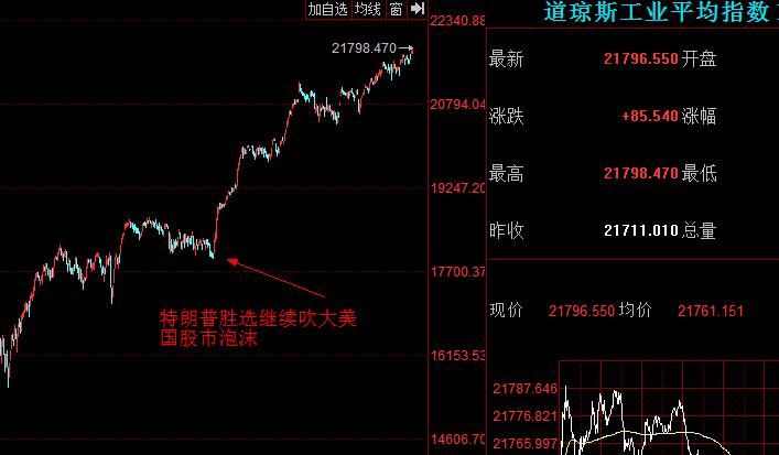 特朗普勝選以來,美國股市大漲,泡沫加劇。圖為2016年1月以來道指K線走勢圖