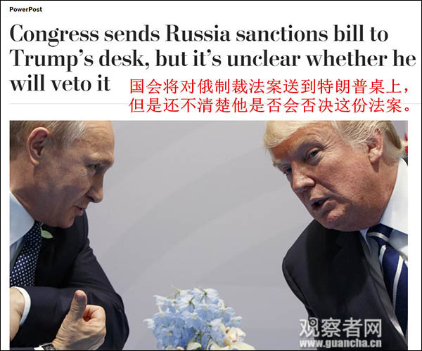 據觀察者網此前報道,當地時間27日,美國參議院幾乎全票通過了眾議院提交的對俄加強制裁法案,並交由美總統特朗普簽署。