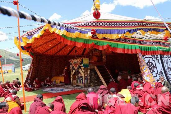 夏日草原的陽光下,班禪大師在貢薩寺準備的華帳寶座上進行講經和灌頂,同時大師還從佛法的角度對僧人和羣眾進行了遵紀守法、團結互助、積極改善生活、改正惡習、維護民族團結和社會和諧等方面的教誨。