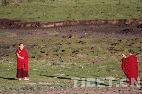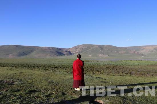 據中國西藏網7月31日報道,7月19日清晨,從玉樹市往西北約80公里的隆寶灘邊停下一個車隊,一位身着絳紅色僧服的年輕僧人走下車來,興致勃勃地步向隆寶灘綠油油的草甸,身後還跟着幾位着僧服的僧人。這一帶屬於玉樹州著名的隆寶灘自然保護區,此時正處在一年中最好的季節。環顧四周,一望無際的高寒草甸和濕地綠油油的,像地毯一樣鋪在這片海拔4200多米的高原谷地上,遠處起伏的山脈像凝固的綠色波浪。