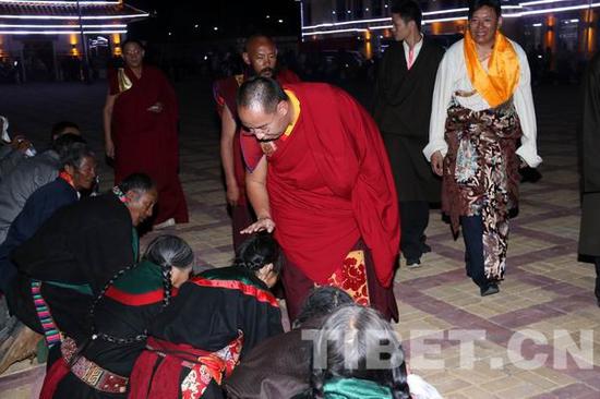 夜已深了,班禪大師還前往治多縣幸福敬老院為一直等候在那裏的老人們一一摸頂賜福,並講經祈頌。有些重病和癱瘓在牀的老人得到班禪大師的摸頂賜福,幸福地閉上眼睛淚流滿面,嘴裏不停地稱頌“謝謝班禪仁波切!”