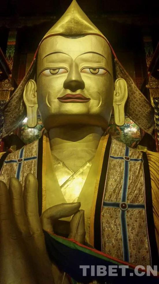 接着,班禪大師來到貢薩寺的宗喀巴大殿,在宗喀巴大師像前進行了祈福開光儀式。這尊宗喀巴大師像是世界上最大的室內銅製鍍金塑像,曾獲得“大世界基尼斯之最”證書,大佛總高35.32米,佛高31.22米,佛腰圍14.98米,蓮花座高4.1米,採用銅、黃金、天珠、琥珀、珊瑚等製作而成。