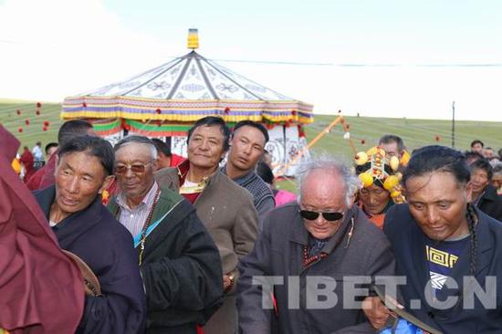 △圖為等待班禪大師摸頂賜福的人羣中,殘疾人和年紀大的信教羣眾得到優先照顧。