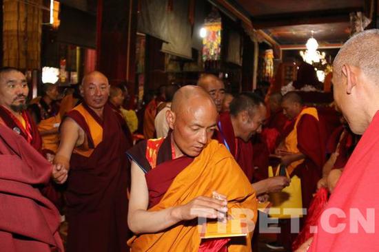 近千名僧人獲得了班禪大師的摸頂賜福,僧人們按照自己心意向班禪大師獻上供養和禮品,班禪大師也一一向僧人們發放佈施和護身符、紀念品。