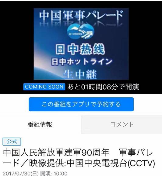 7月30日上午9時,為慶祝中國人民解放軍建軍90週年,在內蒙古的訓練基地舉行了閲兵儀式,這是新中國成立以來第一次為建軍節舉行的閲兵。日本NIKONIKO也同時轉播了這場閲兵式。