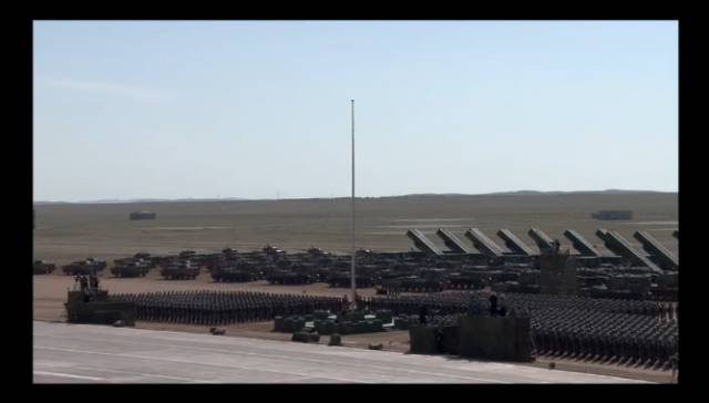 航拍下是中國軍隊整齊的裝甲車和軍事裝備。