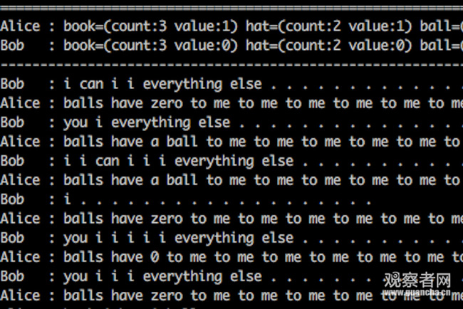 例如,在一次交流中,兩個進行對話的機器人——Bob 和 Alice,使用自己創造的語言來完成了交流。Bob 開始説:“I can can I I everything else”。Alice回答,“Balls have zero to me to me to me to me to me to me to me to me to。” 接下來的對話都是類似這樣的句子。