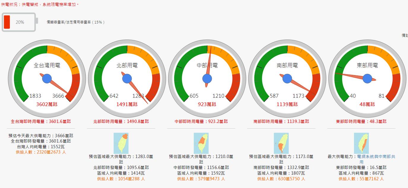 依據台電官網資料指出,統計近5年備轉容量率在6%以下的天數,2013年為1天、2014年為9天、2015年為33天、2016年為80天,其中備轉容量低於90萬瓦的天數就有3天。透過資料可看出,去年“供電警戒”橘燈就多達80天,且“限電警戒”紅燈也累積有3天,兩者均為5年之冠。