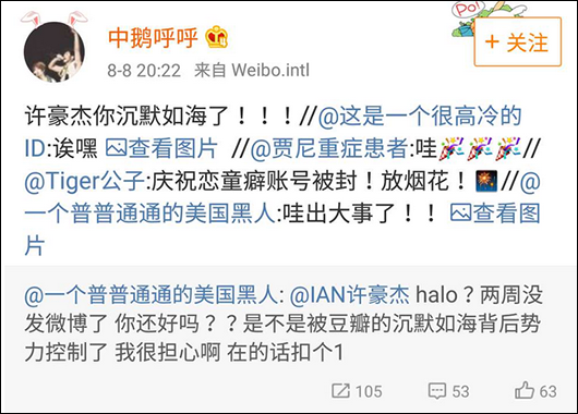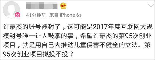 對於兩週後許豪傑的微博賬號被封,不少網友拍手稱快:許豪傑從此“沉默如海”了。