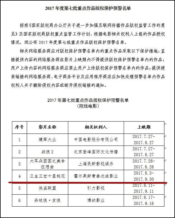 8月8日,國家版權局官微公佈《2017年度第七批重點作品版權保護預警名單》,有網友驚訝地發現,《三生三世十里桃花》這部原著深陷抄襲爭議的作品赫然在列。