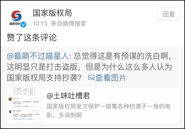 在塵埃落定之前,國家版權局官微也很難發聲直接表明立場,但有網友發現,國家版權局官微悄悄地給兩位網友點了贊。