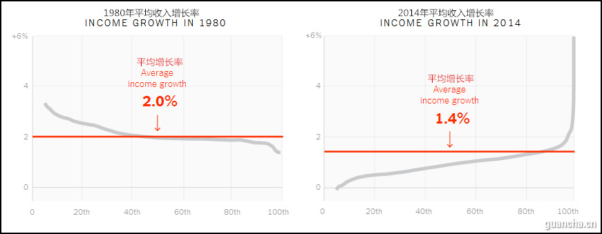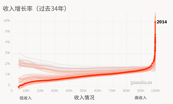 上圖中的紅線大部分都與橫座標幾乎平行,只有在最後才急劇上升。這充分説明,只有少部分且收入非常之多的富人才能感受到經濟的明顯增長。