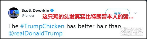 這隻“特朗普雞”的設計者是一位來自西雅圖的美國設計師,他曾表示:“特朗普和公雞還是挺像的,因為他們都喜歡在日出時分打鳴(打鳴tweet,推特tweeter,此處指特朗普愛發推特的習慣)。”