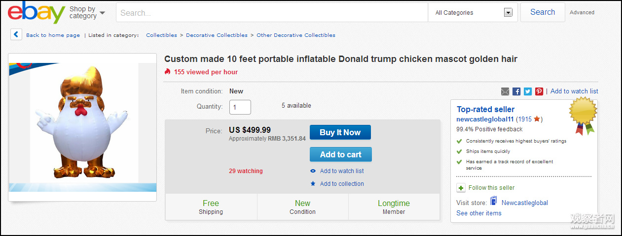 美國知名科技博客GIZMODO也表示,現在在香港eBay上花大約500美元,就可以定製一隻10英尺高的充氣“特朗普雞”。