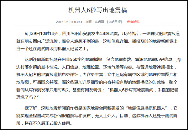 2008年四川汶川地震確定地震參數用時14分鐘,2013年四川雅安地震為1分51秒。去年綿陽地震,地震信息播報機器人便達到了從撰寫到發佈僅用時6秒。