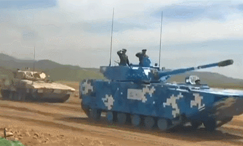 首先是地面裝甲裝備入場式,3款主戰坦克、1款兩棲突擊車、2款履帶式步兵戰車、4款輪式裝甲車等一系列新型裝備依次受閲,本次活動共檢閲了14型36輛裝備。