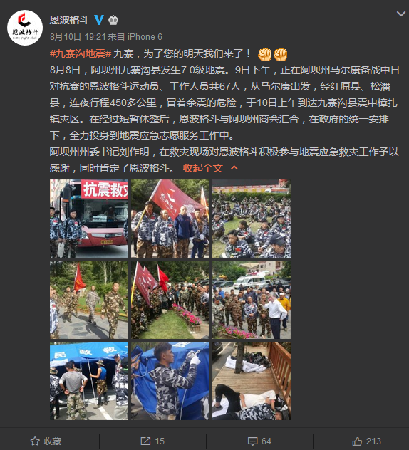 此外,觀察者網在@恩波格鬥微博還發現了這樣一條消息,“壩州州委書記劉作明在九寨溝災區救援現場指導恩波格鬥開展下一步救援行動”。在這則微博視頻中,阿壩州州委書記現場肯定了恩波救助孤兒的做法,“雖然曾經對你這個俱樂部有些所謂的孤兒問題(媒體)有些做了一些誇張的描述,但這個問題我們看主流,更重要的看我們自己的作為,我相信和這次地震一樣,我們的人民羣眾和黨委一條心,咱們千方百計去克服所有的問題,我相信沒有克服不了的”。