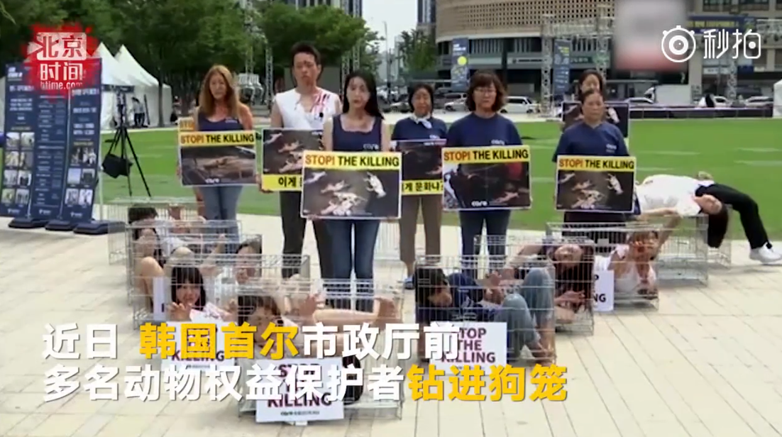 近日,首爾市政廳前,多名動物權益保護者鑽進狗籠,拉出“禁止殺戮”的橫幅,展示各種海報,呼籲禁食狗肉。在韓國,吃狗肉的文化已經存在幾個世紀,近年來,隨着寵物數量不斷增加,一些狗肉餐廳和市場常常引發爭議。