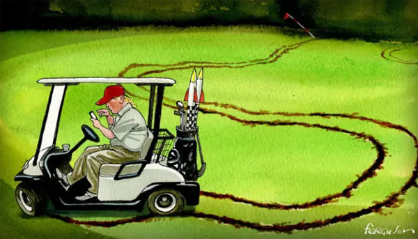 特朗普為國際危機推波助瀾日益與困擾其政府的國內問題分不開。美國前聯邦調查局局長羅伯持·穆勒對俄羅斯干預美國大選的調查越來越牽涉到特朗普的核心圈子。國會陷入僵持,白官走馬燈似的裁員而且勾心 鬥角。現在,美國街頭出現了政治暴力活動,白人至上主義者和新納粹主義者攻擊以至殺死夏洛茨維爾的抗議者,而特朗普從高爾夫球場發表了含糊其辭的聲明。