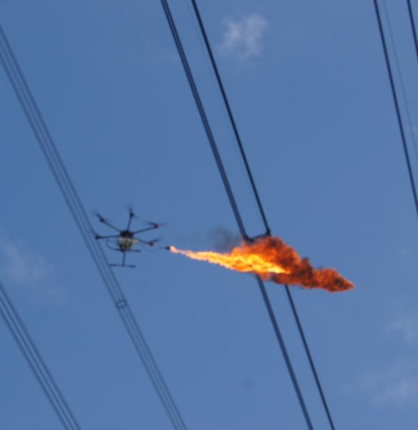 噴火無人機噴出一道火舌,清除高壓線上的飄掛物。(圖:澎湃新聞)
