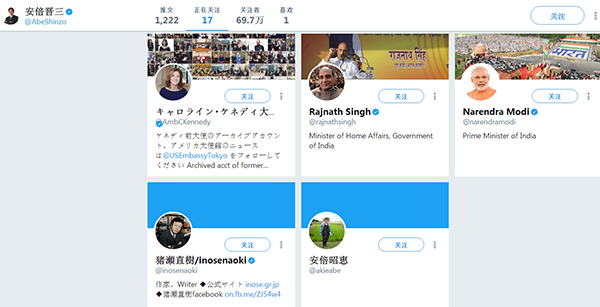 早在2014年,有媒體爆料稱安倍晉三的推特賬號只關注了三個人,除了他的妻子安倍昭惠和日本政治家豬瀨直樹外,第三個人就是莫迪。現在,安倍的賬號關注17個人了(包括奧巴馬和特朗普)。