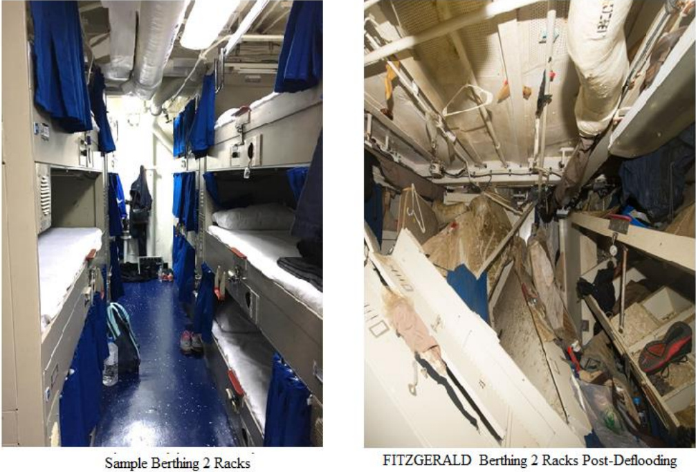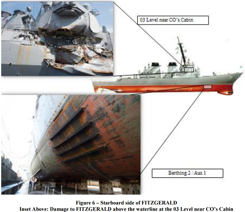 美國海軍週四(18日)發佈了該次事故的初步報告,描述了“菲茨傑拉德號”上碰撞發生後的細節及救援行動。數十名美國海軍士兵從沉睡中被驚醒,爭分奪秒地爬上梯子,逃離被水淹沒的船艙。湧入的海水起初及腰深,後來漫過脖頸,士兵們推開牀墊、壁櫃及其他漂浮物,爭相爬上梯子求生。最後一名士兵已經淹沒在水下,被同伴拉了上來。菲律賓貨船直接撞上了該艦艦長本森中校(Cmdr. Bryce Benson)的艦長室,撞出一個大洞將其捲入其中。五名士兵用錘頭和壺鈴砸開艙門去救本森艦長,後者當時正掛在船邊上。