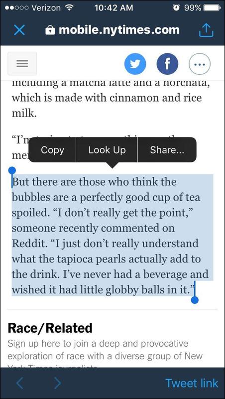8月16日,《紐約時報》刊登了一篇由美國特約記者考夫曼(Joanne Kaufman)撰寫的文章,名為《你的茶裏有小珠子嗎?它們本來就在那》(The Blobs in Your Tea? They’re Supposed to Be There)。