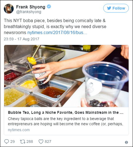 同行也看不下去了,《洛杉磯時報》記者Frank Shyong在Twitter上寫道:《紐約時報》的這篇文章,除了讓人好笑的過時和令人驚訝的愚蠢外,也説明了為什麼我們需要多元新聞編輯室。