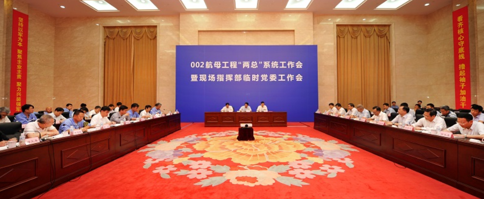 胡問鳴還要求“切實發揮總裝廠、總體所龍頭牽頭作用,組織協調各參研參試單位”,“嚴格系統設備試驗技術狀態確認,確保建造和試驗工作平穩、有序、高效開展”。消息還配有一副會議現場的照片,照片顯示會場中間的會議名稱和主題是“002航母工程‘兩總’系統工作會暨現場指揮部臨時黨委工作會”。