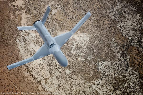 飛行中的“復仇者”無人機,該機是首架原型機,代號“天使一號”