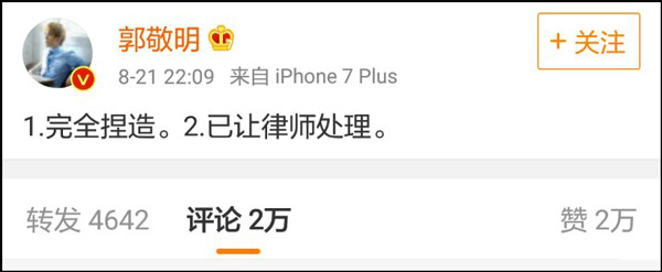 隨後,郭敬明回應李楓的爆料,他表示指控完全捏造,已交給律師處理。