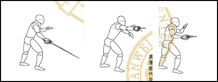 格擋刺擊的示意圖,通過旋轉劍刃來以強劍身撥開對方的刺擊