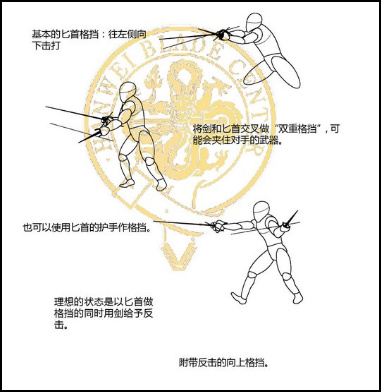 招架匕首在格鬥中最主要的作用便是格擋對方的刀刃,其大護手和之後的各種變種都是以阻擋對方劍刃並卡住為目的設計的。