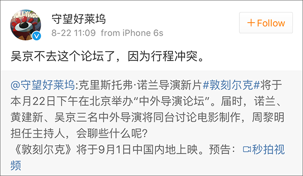 據新浪娛樂“好萊塢頻道”官微今天的微博,《戰狼2》導演吳京因行程衝突,將缺席原定於今天(8月22日)與諾蘭導演的同台會談。