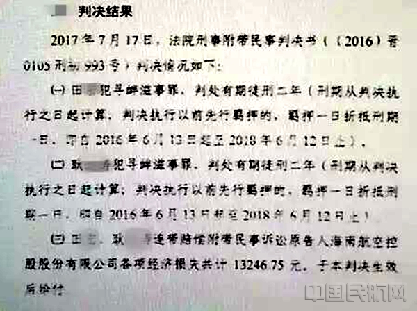 三、田某、耿某連帶賠償附帶民事訴訟原告人海南航空控股股份有限公司各項經濟損失共計13246.75元。於本判決生效後給付。(民航局公安局)