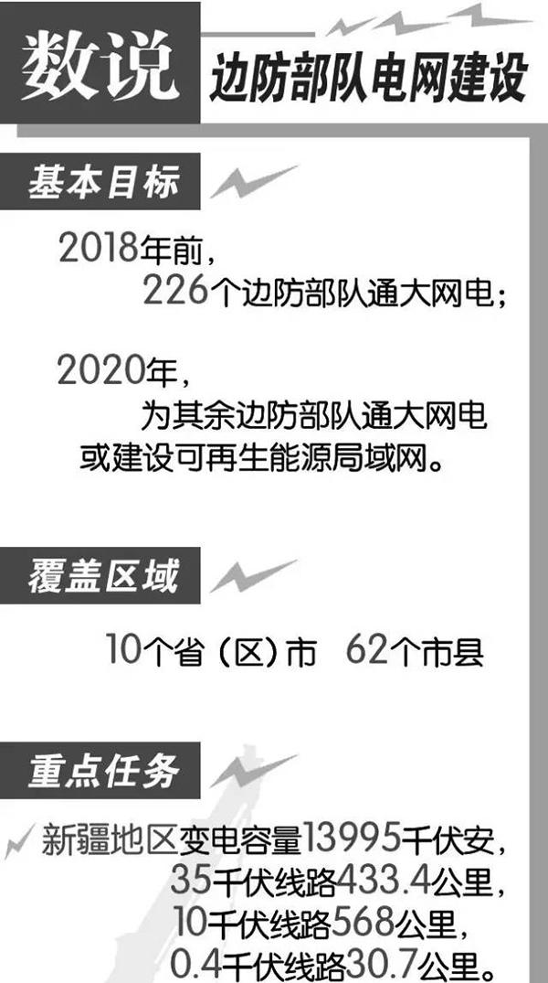 長期以來,受自然環境和技術條件等因素制約,內蒙古、新疆、西藏等偏遠地區邊防部隊長期受用電難題困擾。為貫徹落實軍民融合深度發展國家戰略,軍委後勤保障部積極協調國家能源局,將部隊電網建設融入國家能源建設“大盤子”,按照“國家政策引導、企業組織實施、軍隊購買服務”的原則,高效推進邊防部隊電網建設。去年底,國家能源局和軍委後勤保障部聯合印發《邊防部隊電網建設實施方案》,計劃於2020年前解決軍隊和武警邊防部隊所有未連通國家電網連隊哨所的用電難題。