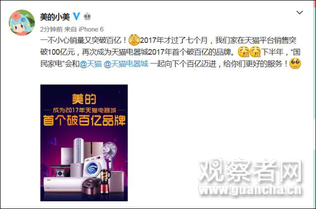 8月2日,美的在其官方微博宣佈,美的今年在天貓平台銷售已經突破100億元。2017年才過去7個月,美的就完成了去年一整年在天貓的銷售額,完美詮釋了什麼叫“天貓速度”。目前阿里旗下的速賣通,投資的電商平台lazada、Tokopedia等,已是俄羅斯、西班牙、東南亞等海外市場首屈一指的電商網站。