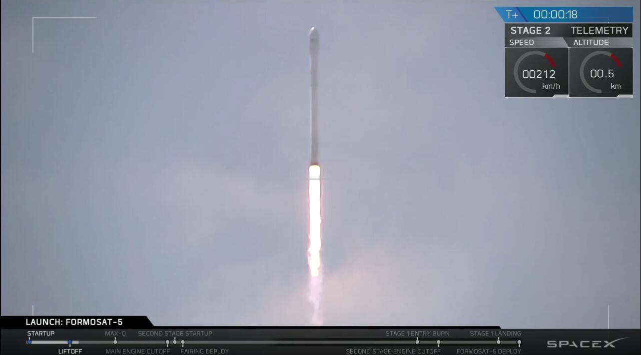 據台媒25日報道,台灣地區首顆自主研製的高解析度遙測衞星“台衞五號”(台方稱“福衞五號”),於25日凌晨2點51分(美西時間24日上午11點51分)在美國正式發射升空,並經過兩次火箭脱離,飛到離地表723公里的外太空,完成衞星主體與火箭脱離程序。