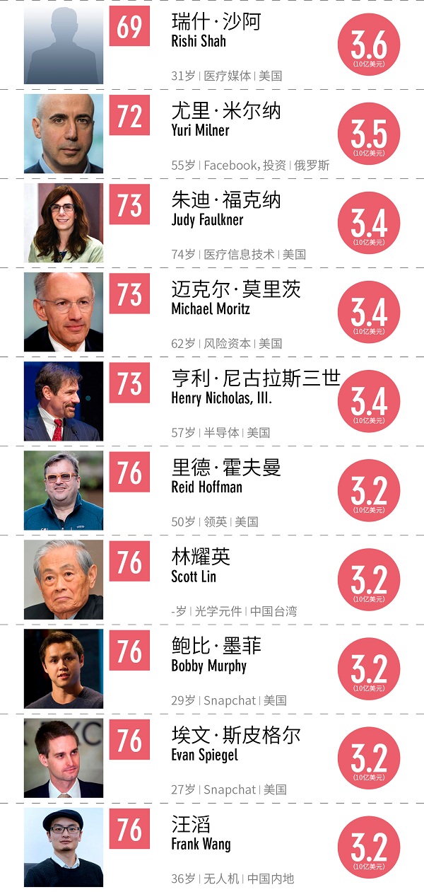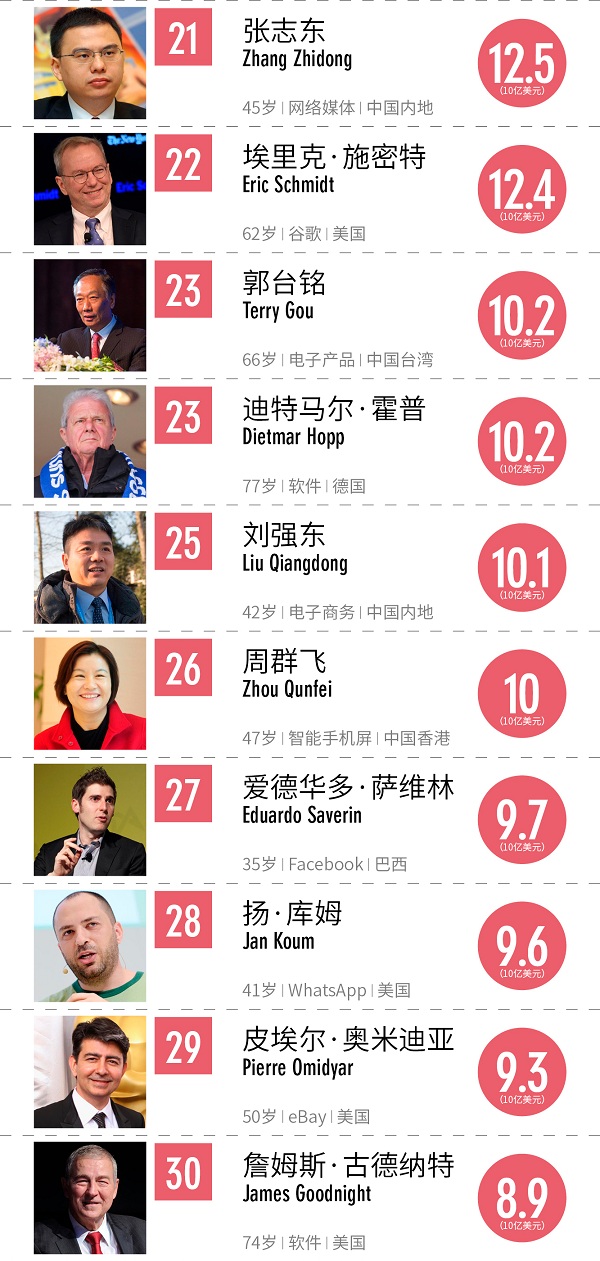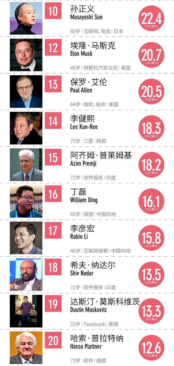 榜單顯示,排名前六的均為美國的科技界巨頭,其中微軟的比爾•蓋茨(845億美元),亞馬遜的創始人貝索斯(817億美元)和臉書的創始人馬克•扎克伯格(696億美元)分列前三位。前十中有8個美國人,但是有兩位中國人頑強的在榜單中幫助世界其他國家佔據了一席之地,馬雲以374億美元排名第七,馬化騰僅僅相差7億美元,以367億美元排名第8。