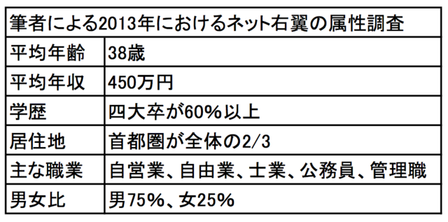 經常發表“讓韓國人滾出日本”、“不要讓中國人在日本工作”等歧視性言論、鼓吹毫無根據陰謀論的網絡右翼噴子中,醫生、註冊會計師、中小企業經營者、個體經營者、房地產從業者、教師、地方公務員等佔絕大比例。