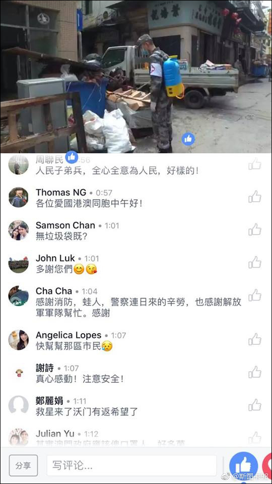澳門網絡也對解放軍駐澳部隊協助救災進行了直播,微博網友@斯圖卡98 截下部分澳門網民的評論。