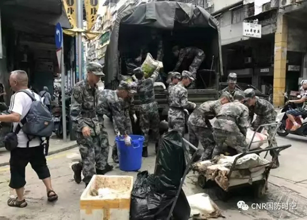 經澳門特別行政區政府請求,中央人民政府批准,駐澳門部隊根據中央軍委命令,於8月25日9時45分,出動官兵約千人,協助澳門特別行政區政府展開救災。